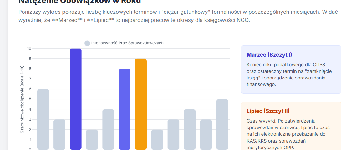 Poniższy wykres pokazuje liczbę kluczowych terminów i „ciężar gatunkowy” formalności w poszczególnych miesiącach. Widać wyraźnie, że **Marzec** i **Lipiec** to najbardziej pracowite okresy dla księgowości NGO.